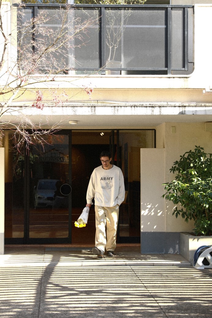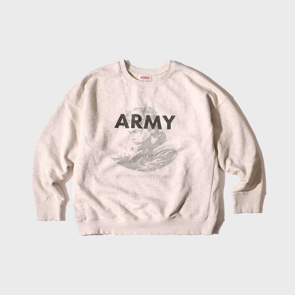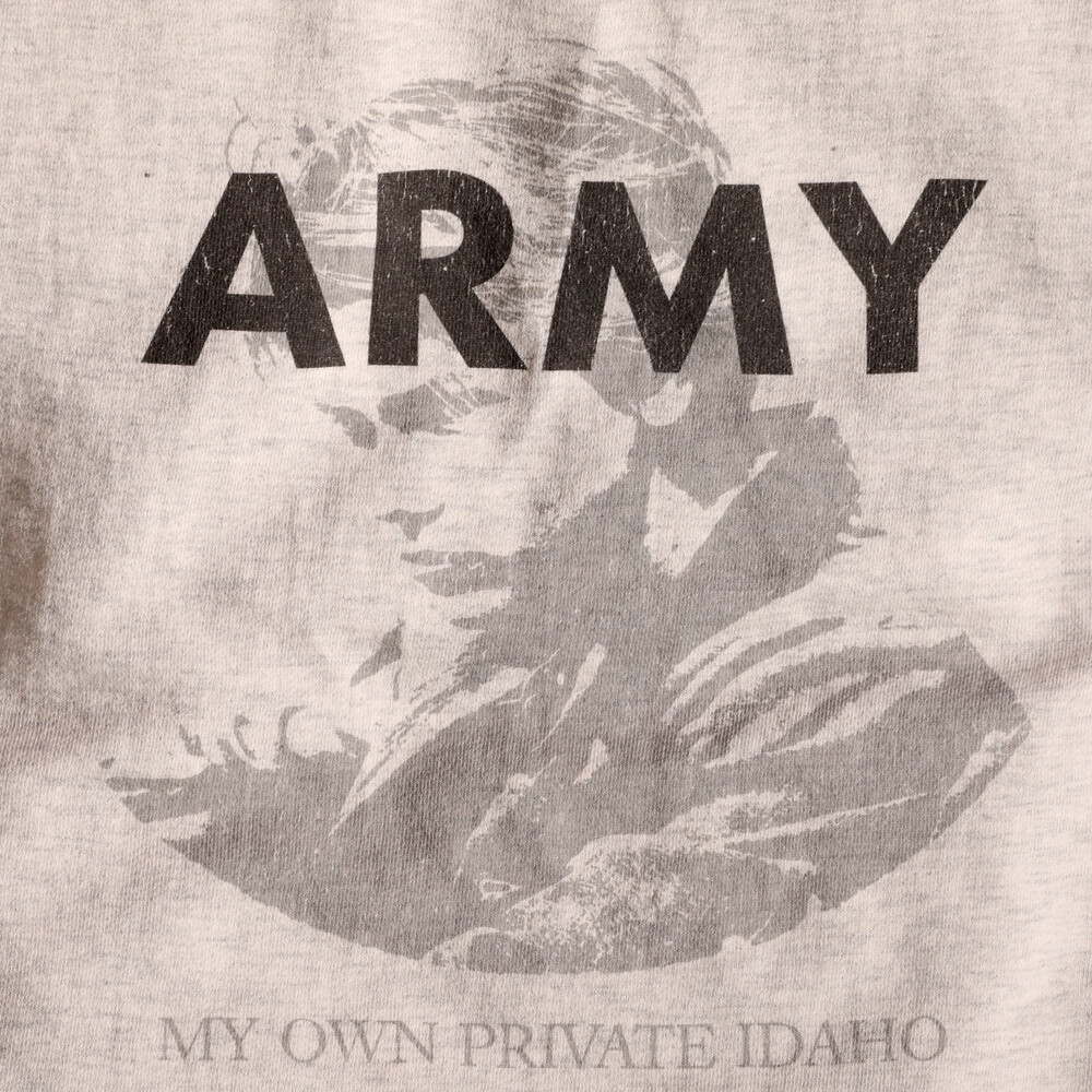 전면 프린팅의 경우 리버피닉스 주연의 영화 <아이다호> 의 장면을 디지털 나염기법으로 표현. 하드 워싱을돌리고 빈티지 데미지 디테일을 추가적으로 작업. 하드 워싱을 통해 날염 프린팅의 색감이 자연스레 빠지고 전체적으로 빈티지 효과를 구현했습니다.