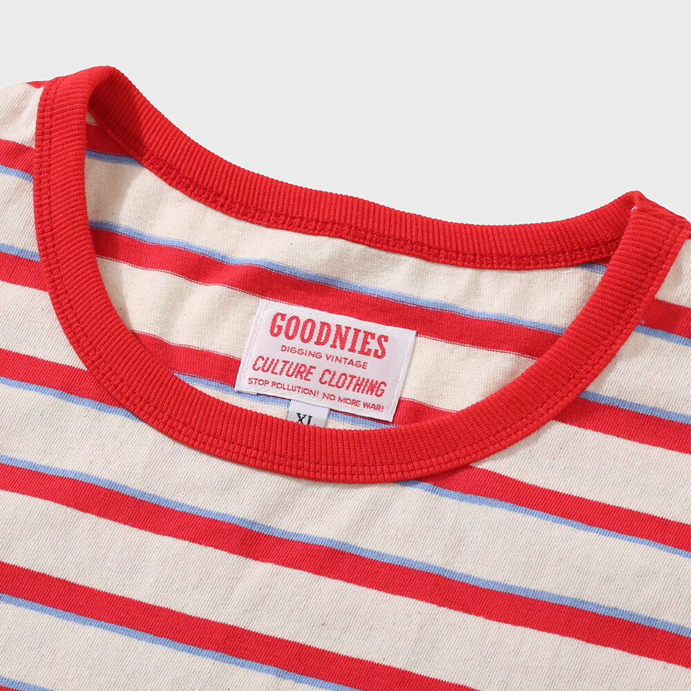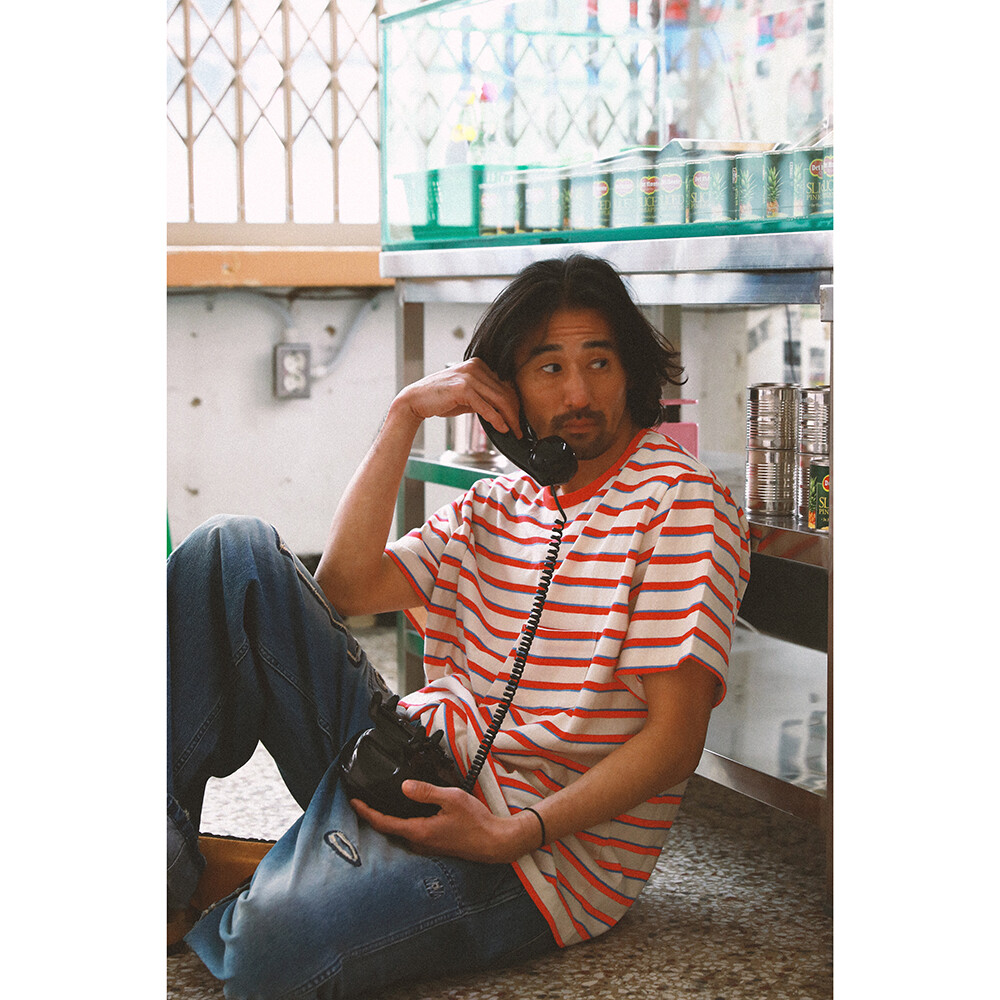 80년대 서퍼, 스케이트보더 룩 무드의 빈티지 스트라이프 원단 80년대 무드라면 부츠컷 데님에 이런 무드의 스트라이프 상의가 어울릴 것 같았습니다.